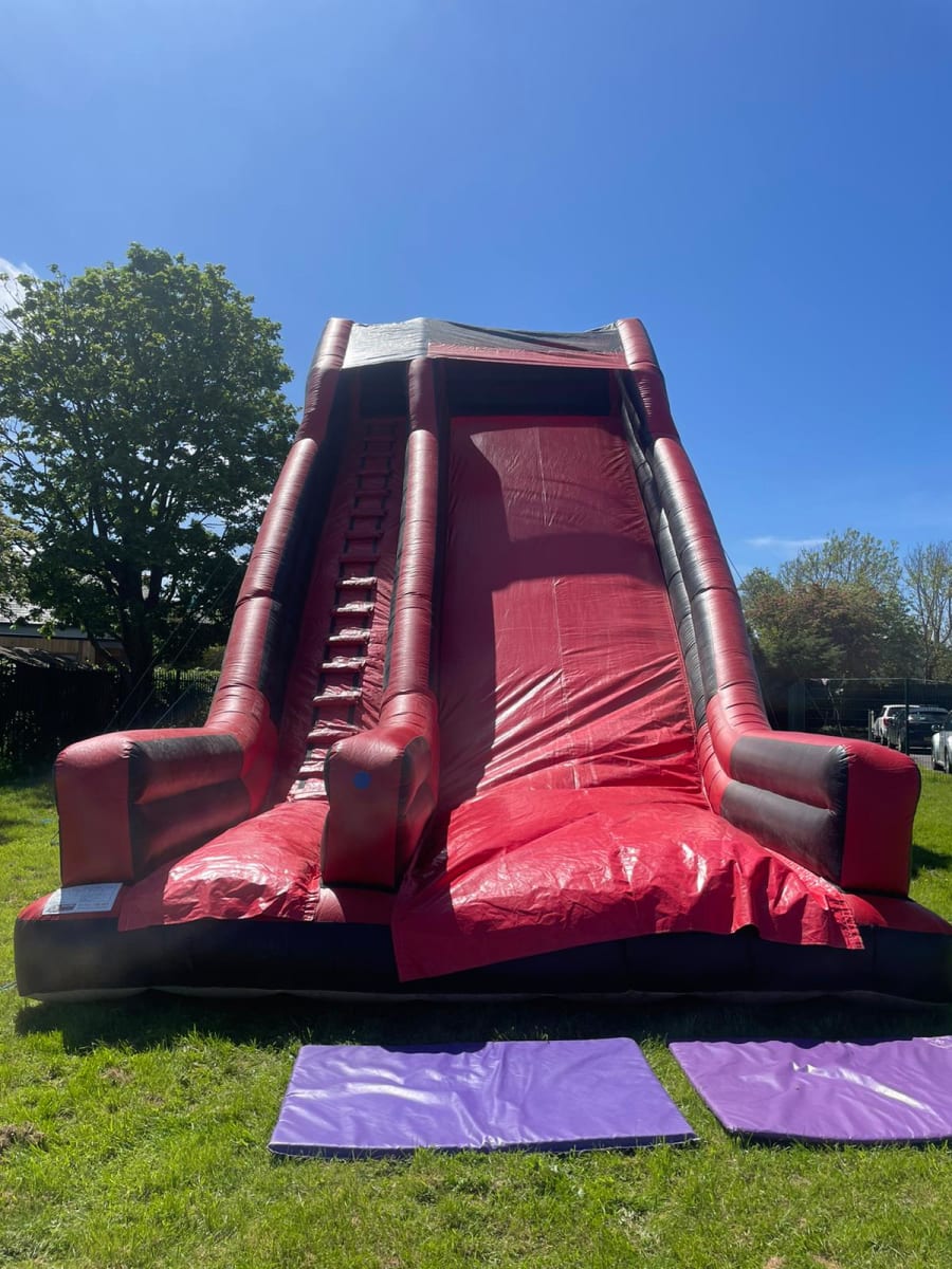 Not for the fainted Hearted - users climb up the vertical ladders ready to slide down the MEGA inflatable slide - in a fantastic red and black colour scheme it will blend in with most themes.