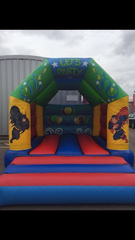 This bouncy castle is fantastic and very brightly colored in blue and green. The painted artwork features the characters of the popular Batman V Superman movie. Great for those summer parties comes with a built in safety net at the back to stop children climbing on the back wall as well as a rain cover for the annoying Cambrian weather.