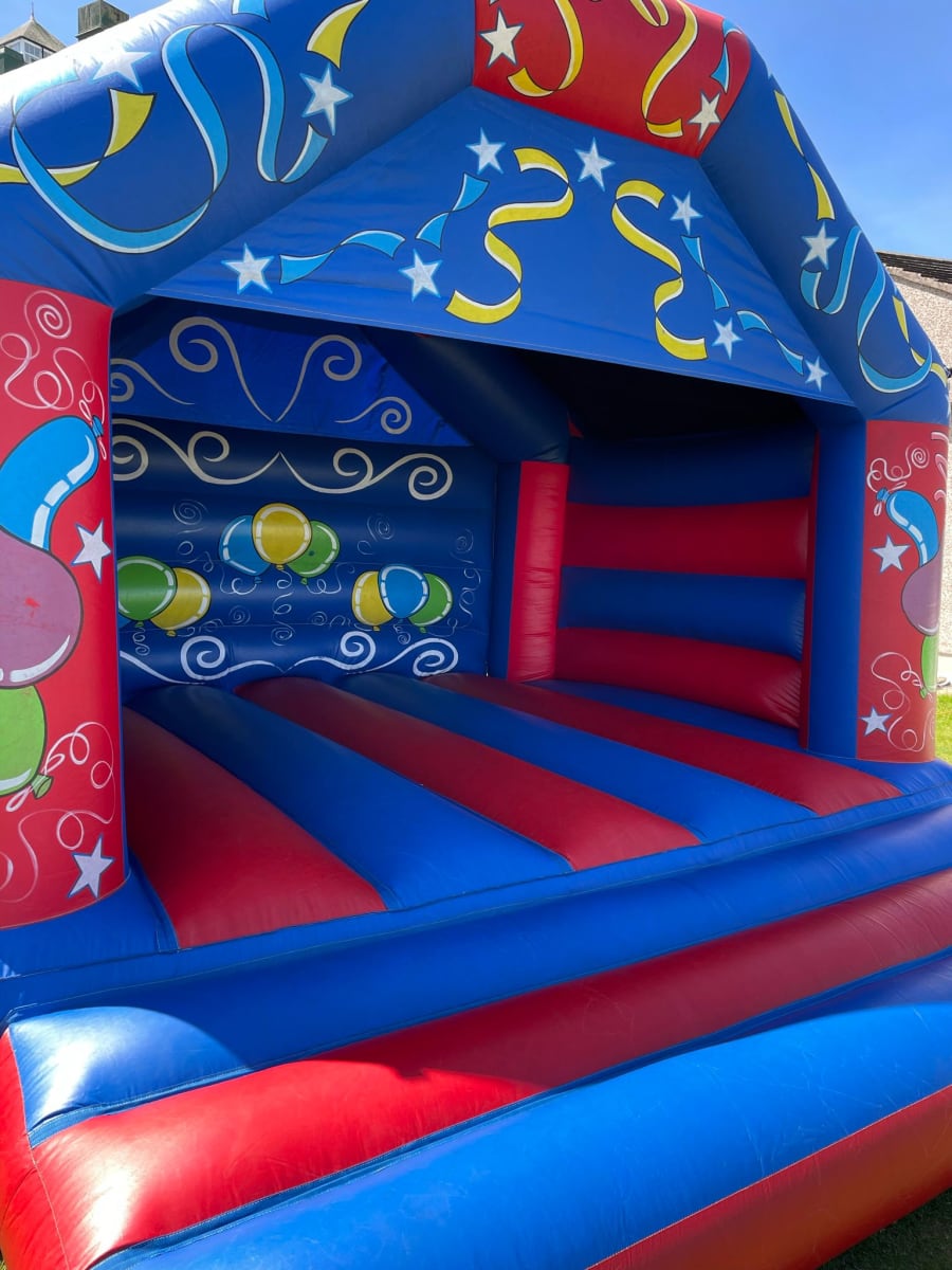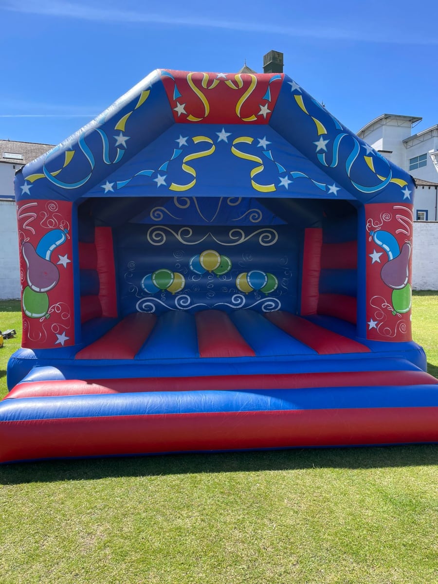 Allowing groups of up to 14 people to take part at once when you hire it, our large bouncy castle is an impressive 6m wide inflatable that’s brightly decorated in red and blue with lovely hand painted artwork featuring streamers and balloons its sure to go down a storm and match any style of event you have planned.