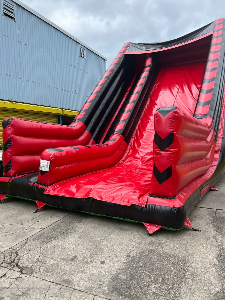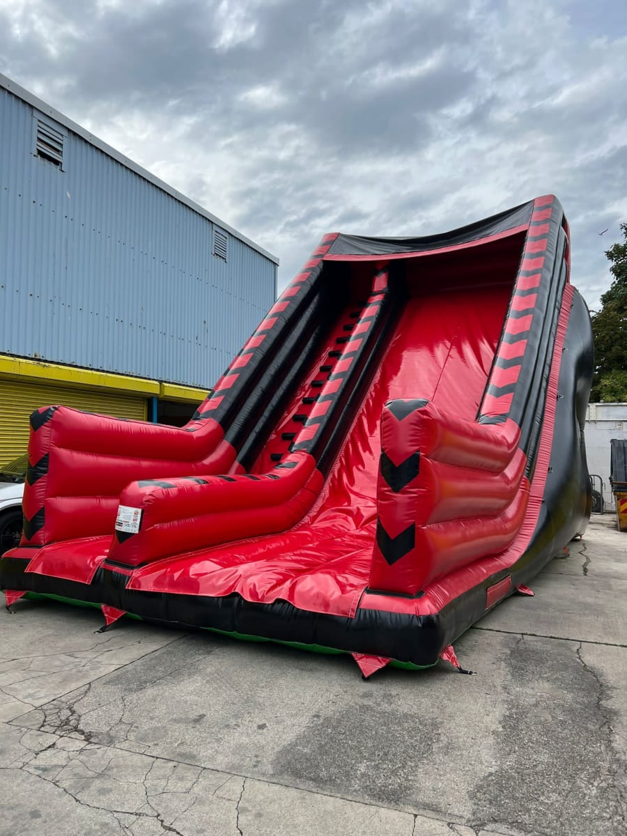 Not for the fainted Hearted - users climb up the vertical ladders ready to slide down the MEGA inflatable slide - in a fantastic red and black colour scheme it will blend in with most themes.