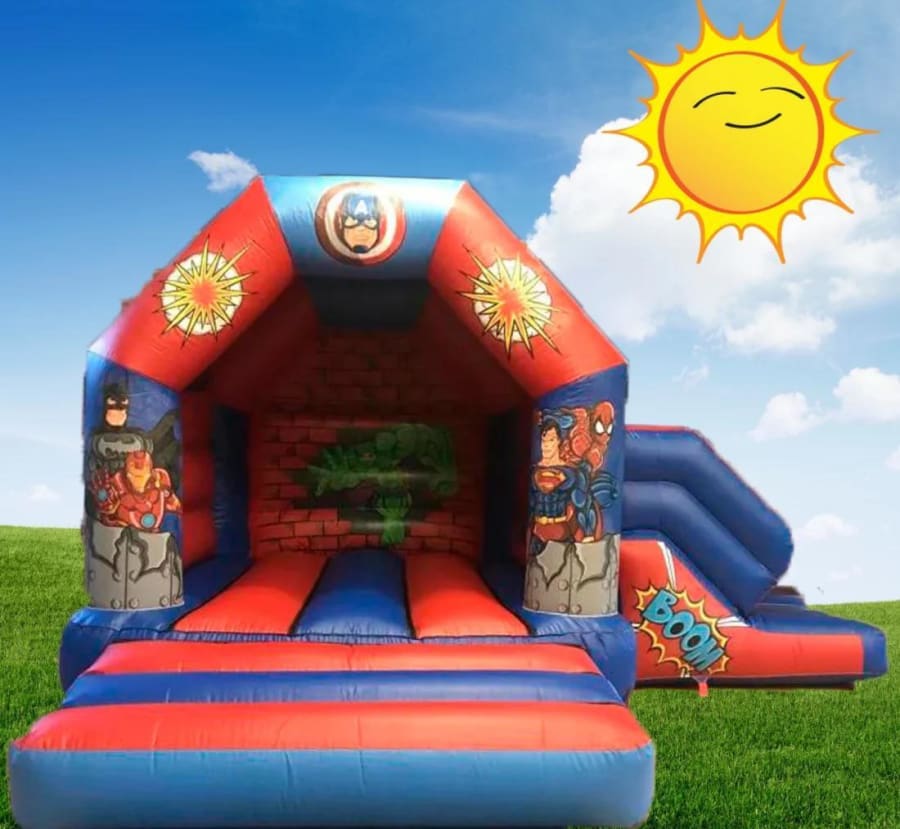 Brand new for Summer 2022 is our amazing superhero bouncy castle & slide combination perfect for any little boy and girl - it features amazing hand painted artwork with a red and blue colour scheme that's sure to go with any theme you have for the party - combining a bouncy castle and inflatable slide is sure to provide hours of fun for all children.