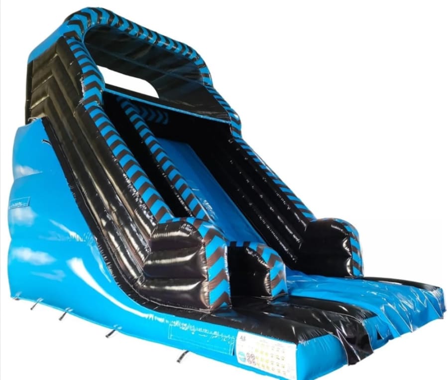 Here we go guy's yet another fantastic slide we have added to the Mr Bounces Crazy Castle hire fleet, Our huge 12ft platform slide is a real eye catcher at any event and will surely draw in the crowds from miles around. Kid's & Adult's of all ages will climb up the ladder and get the ruse of there life as they slide down. Featuring a extra long run off for safety & a fully enclosed at the top you will be hard pushed to find a safer mega slide. Artwork is blue and black chevrons and will be perfect for any birthday party or Funday you might be planning!